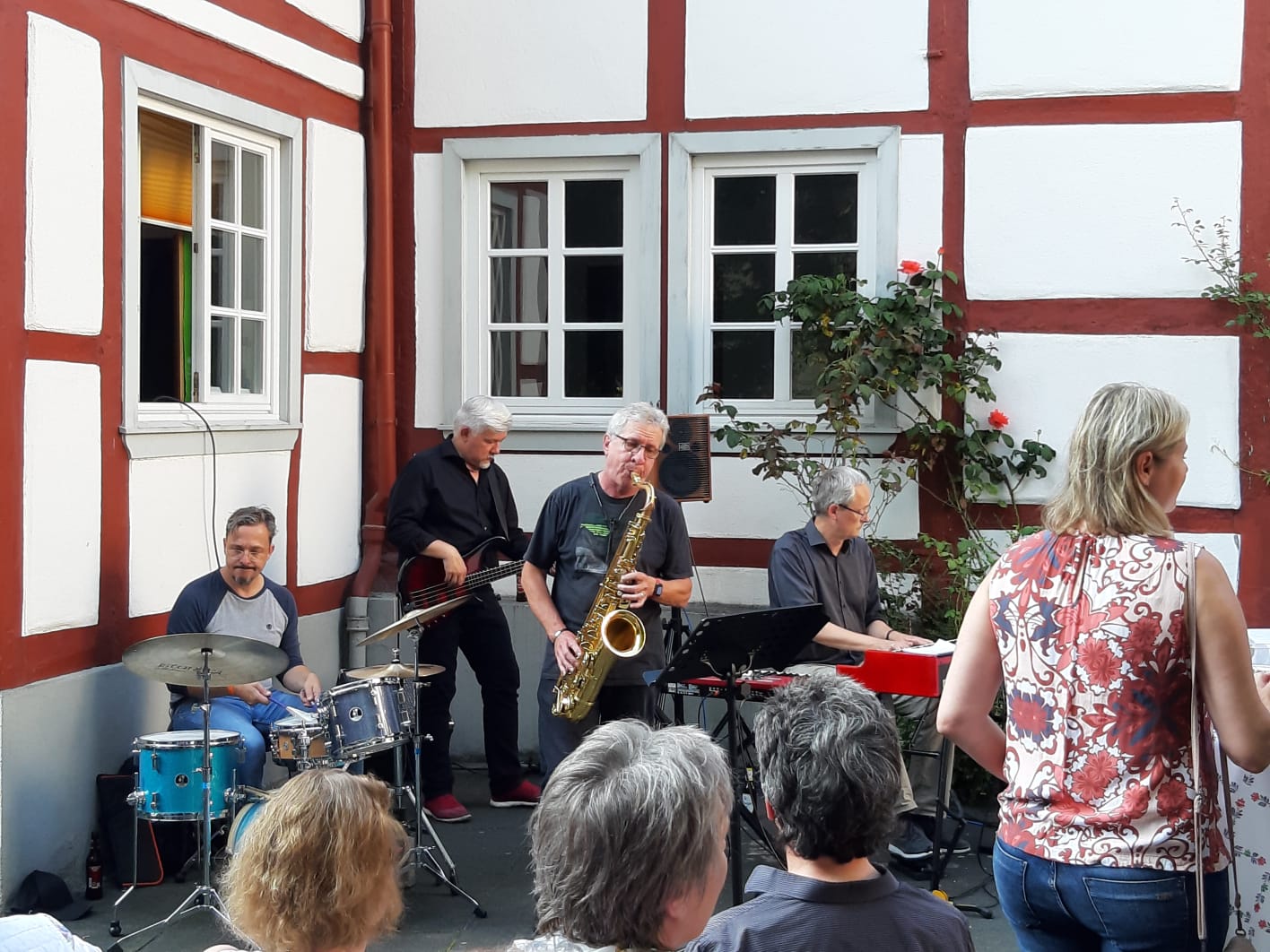 Wunderbare Klänge schallten am Sonntagabend, 25.08.2019, durch den kleinen Hafenort Oberwinter. Die evangelische Kirchengemeinde hatte eingeladen zu „Jazz an der Kirche“ mit dem Pepe Joma Kwartett und der ortseigenen Gruppe A-Capella OW. Bei schönstem Sommerwetter versammelten sich im Laufe des Abends etwa 200 Zuhörer auf dem romantischen Vorplatz der Kirche, um der Musik zu lauschen, im Takt zu wippen oder auch richtig mitzusingen. Das Pepe Joma Kwartett bestehend aus Peter Trier-Hesse (Saxophon), Peter Schwöbel (Bass), Johannes Quack aus Oberwinter (Keyboards) und Marcus Specht (Drums) brachte schwungvoll und sehr gekonnt Stücke aus den letzten sechs Jahrzehnten zu Gehör. Sowohl Standards, Latin, Cool Jazz, Balladen als auch Eigenkompositionen gehören zu ihrem umfangreichen, toll dargebotenen Repertoire.